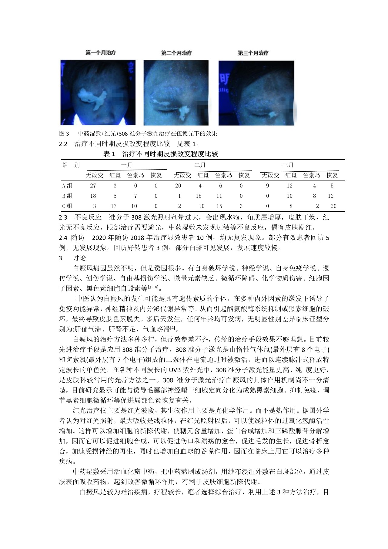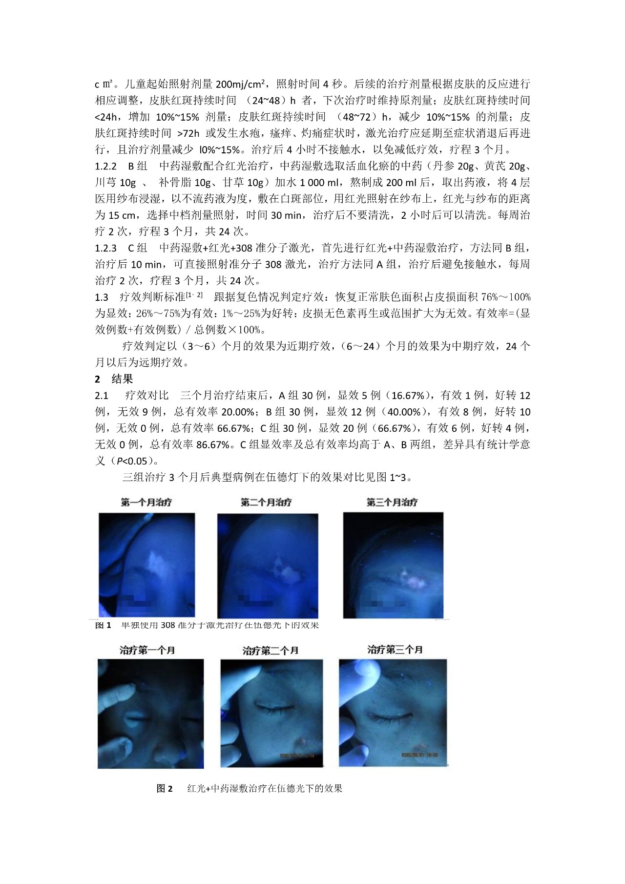 【摘要】目的 探索白癜风治疗的有效方法 .方法 选取2017年1月至2020年8月某白癜风医院90例门诊及住院患者为观察对象,随机分为3组,每组30例,分别采用三种方法 治疗,对治疗效果进行对比.结果 采用准分子308激光治疗的A组,30例患者...